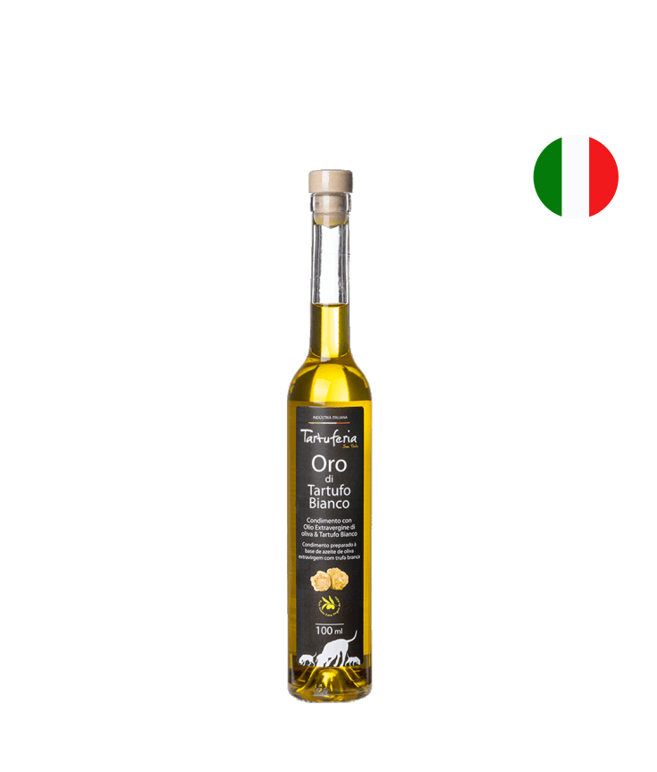 Azeite de Trufas Brancas feito com azeite monovarietal e infusão de Trufas Brancas. Leva na embalagem uma chuva de Trufas Brancas que garante um sabor intenso de Trufas Brancas. Acidez máxima 0,3%.