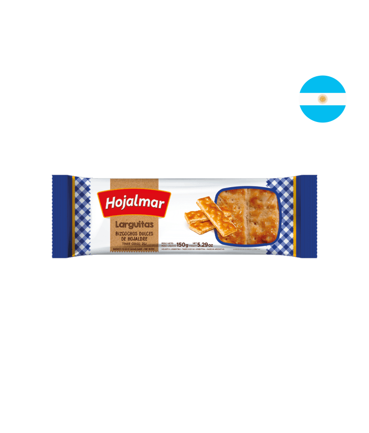 O Biscoito Argentino Hojalmar Larguitas (150g) é uma iguaria folhada, leve e crocante, produzida na Argentina. Com sabor suave de baunilha e acabamento dourado, essas tiras finas e doces são ideais para acompanhar café, chá ou mate. É um produto clássico, conhecido por derreter na boca