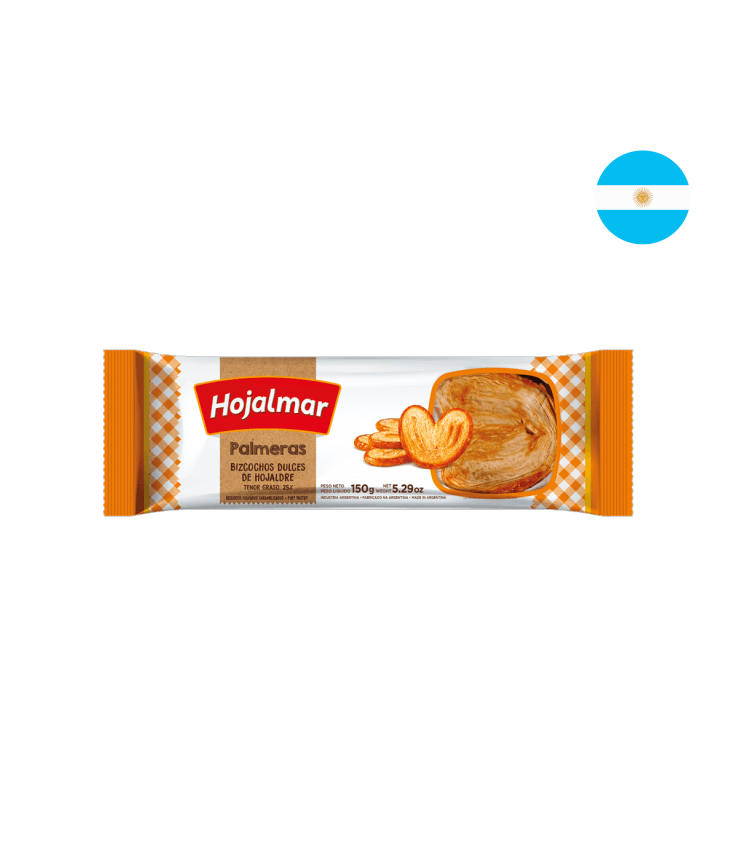 O biscoito Hojalmar Palmeras é um clássico doce argentino, caracterizado pelo formato de coração (ou palmeira), massa folhada crocante, leveza e um delicado toque caramelizado que derrete na boca. Produzido na Argentina, é ideal para acompanhar chás, cafés ou mate, pesando geralmente 150g