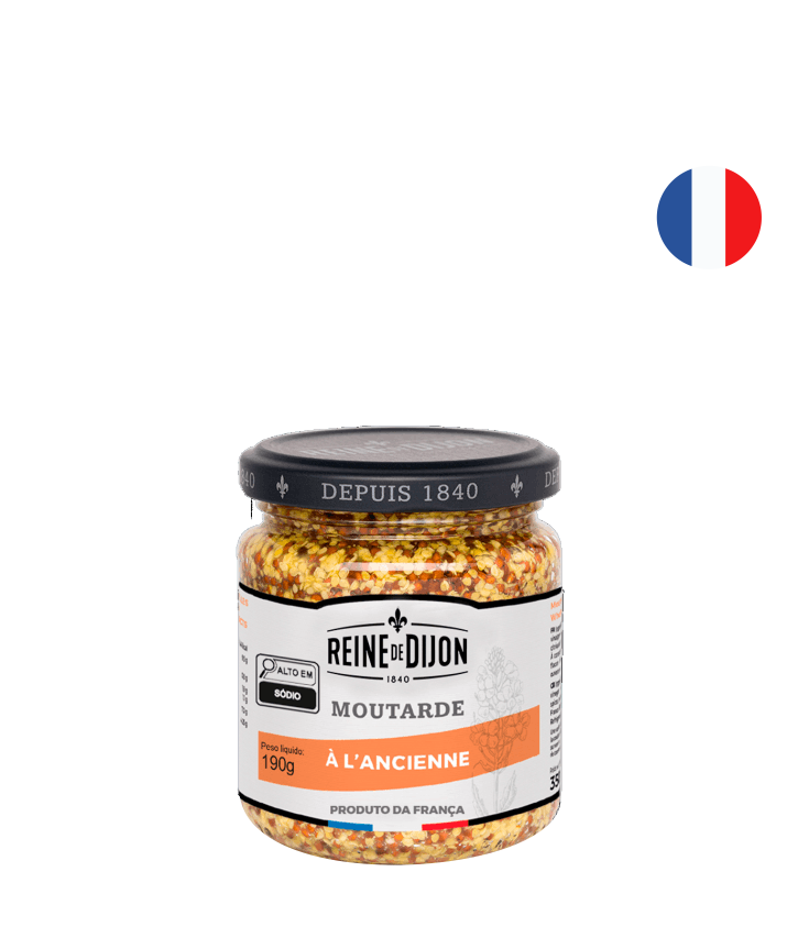 A mostarda em grãos Reine de Dijon é elaborada com sementes inteiras, vinho branco, vinagre, sal e especiarias. Também chamada de (Ancienne), sua textura granulada acompanha perfeitamente todas as carnes, peixes e legumes assados. Sendo frequentemente usada no preparo de molhos para salada