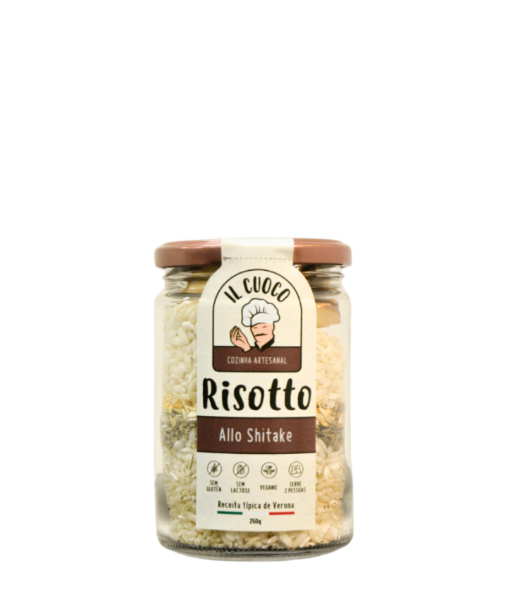 Arroz arbório, shitake, cebola em pó, alho em pó, pimenta em pó e salsa desidratada.